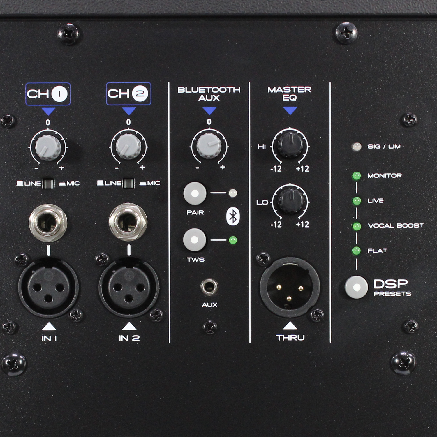 Una selección de entradas permite el uso con una variedad de fuentes. Un procesador de señal digital fácil de usar con ajustes preestablecidos simplifica la personalización de la respuesta del ECL12.2 para su uso como red principal de entrada, como cuñas de monitor, para reproducción de música, para mejorar la inteligibilidad del habla y para una mejor calidad de graves. final y sonido más cálido. Los controles de agudos (Hi) y graves (Lo) aumentan o reducen en 12 dB para compensar las anomalías de la habitación.