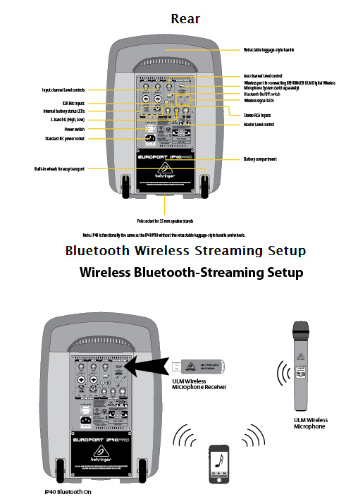 BEHRINGER MPA-40BT,equipo de PA Behringer de amplificacion Clase D y conexion Bluetooth con compatible para la conexion de cualquier aparato y compatible con el microfono inalambrico Behringer ULM100 USB,posibilidad de bateria (hasta 12 horas) Altavoz de 8 pulgadas y 40 Watios, 2 entradas combo para microfonos con ganancia independiente, entrada auxiliar RCA con control de Ecualización y toma USB para micro wireless behringer . Vaso standard de 35″ para soporte.