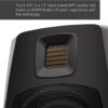 - La placa trasera del altavoz izquierdo cuenta con entradas equilibradas de 1/4″ para uso opcional con una interfaz de audio, además de interruptores alimentados por DSP para abordar problemas acústicos comunes que surgen de la colocación del altavoz. El panel frontal incluye una toma de auriculares y una perilla de volumen