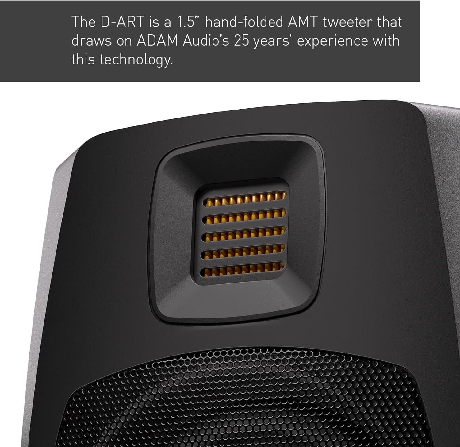 - El D3V cuenta con un D-ART (Tweeter de cinta acelerado de escritorio) de 1.5 pulgadas para la misma reproducción precisa e infatigante de alta frecuencia por la que se conocen los monitores establecidos de ADAM Audio