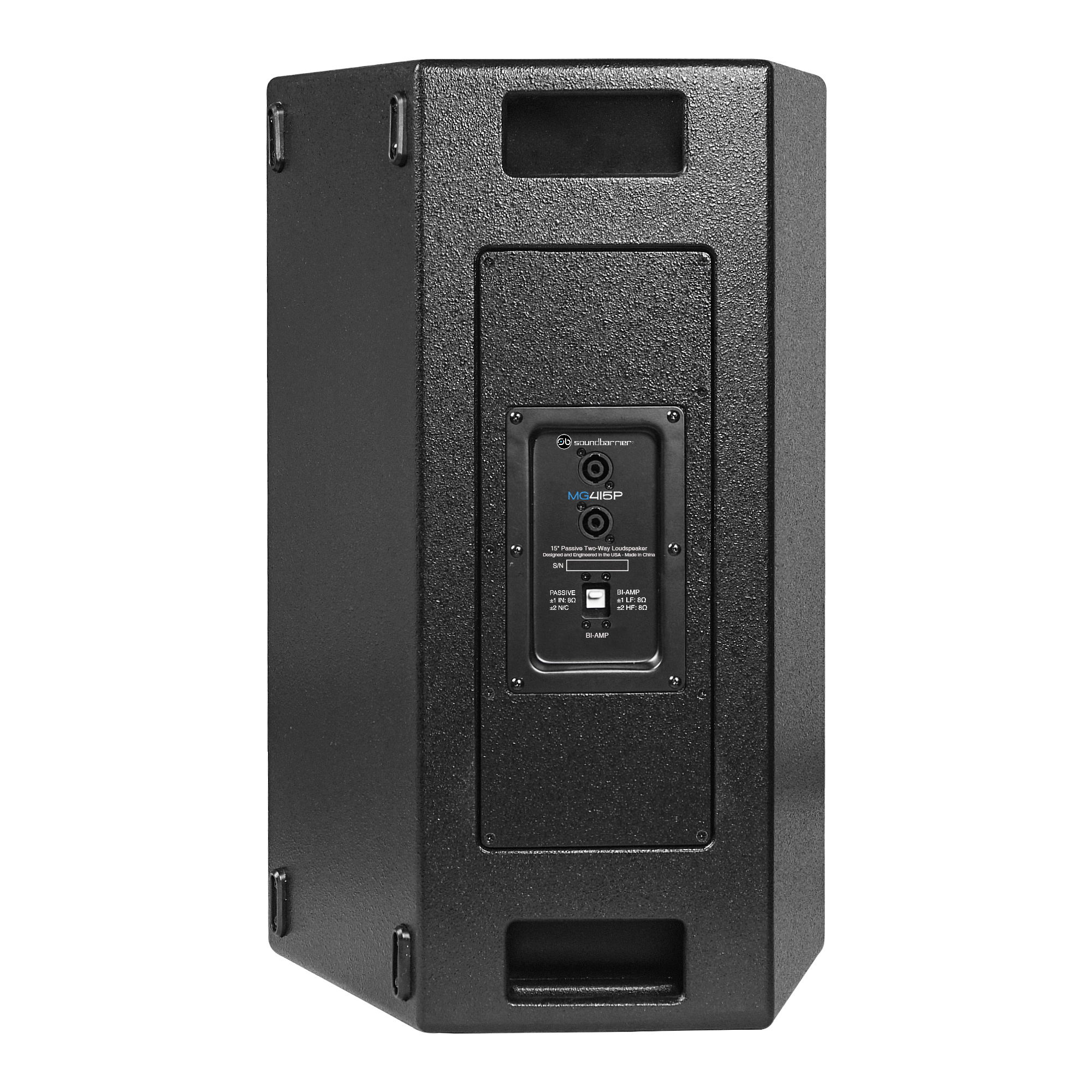 Los gabinetes pasivos MG de 12″ y 15″ se pueden operar en modo de rango completo o biamplificado utilizando el interruptor empotrado de alta corriente montado en la placa de entrada del panel trasero.