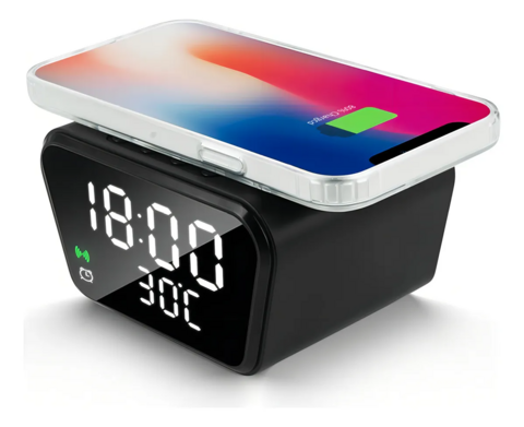 • Reloj electrónico 2 en 1 que combina las funciones de despertador y cargador inalámbrico, proporcionando comodidad y practicidad.