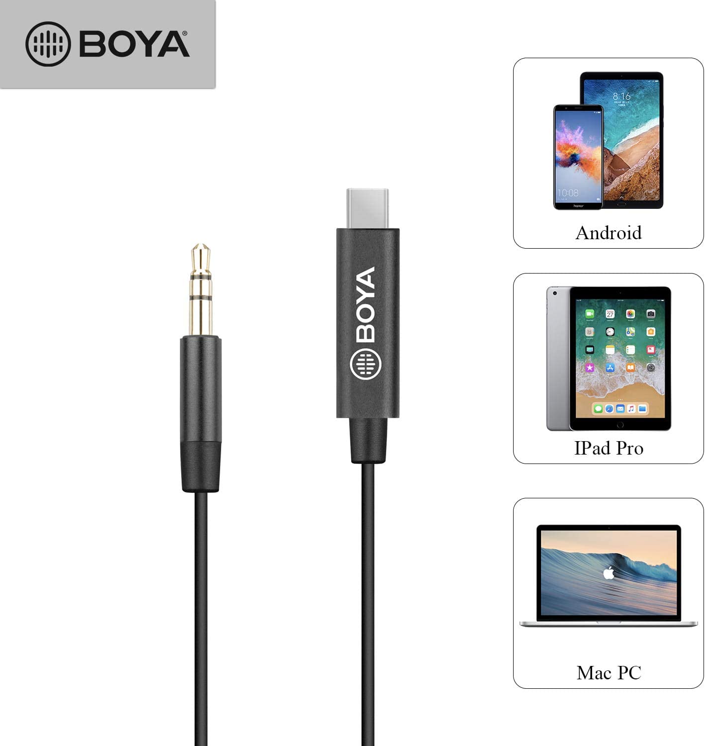 - BOYA BY-K2 es un cable adaptador de jack de 0.138 in macho TRS a macho tipo C.