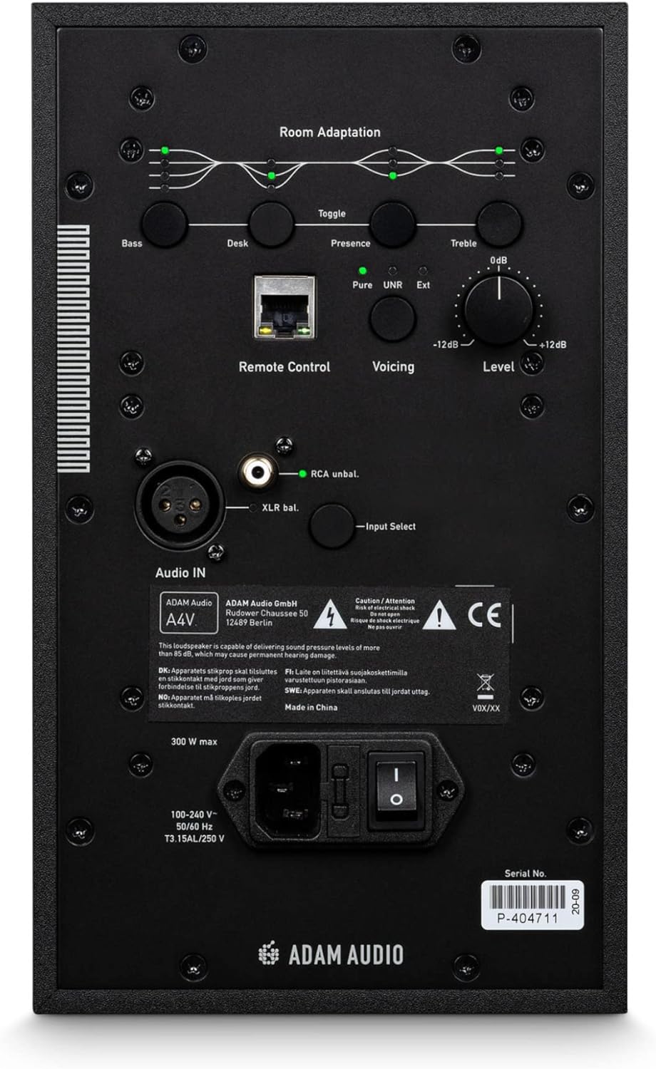 - Adaptación de la habitación: hay cuatro bandas de ecualización de adaptación de habitación en el panel posterior del altavoz ADAM Audio A4V, incluyendo graves, escritorio, presencia y agudos. Cada banda se puede ajustar en pasos predefinidos, proporcionando más de 100 opciones de afinación para ayudar a compensar los problemas acústicos comunes causados por la colocación del altavoz