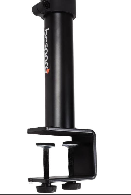 Soporte multifuncional con una superficie plana de 300 x 200 mm, que tiene una abrazadera en lugar de una base, adecuada para fijarla, por ejemplo, a un escritorio.
