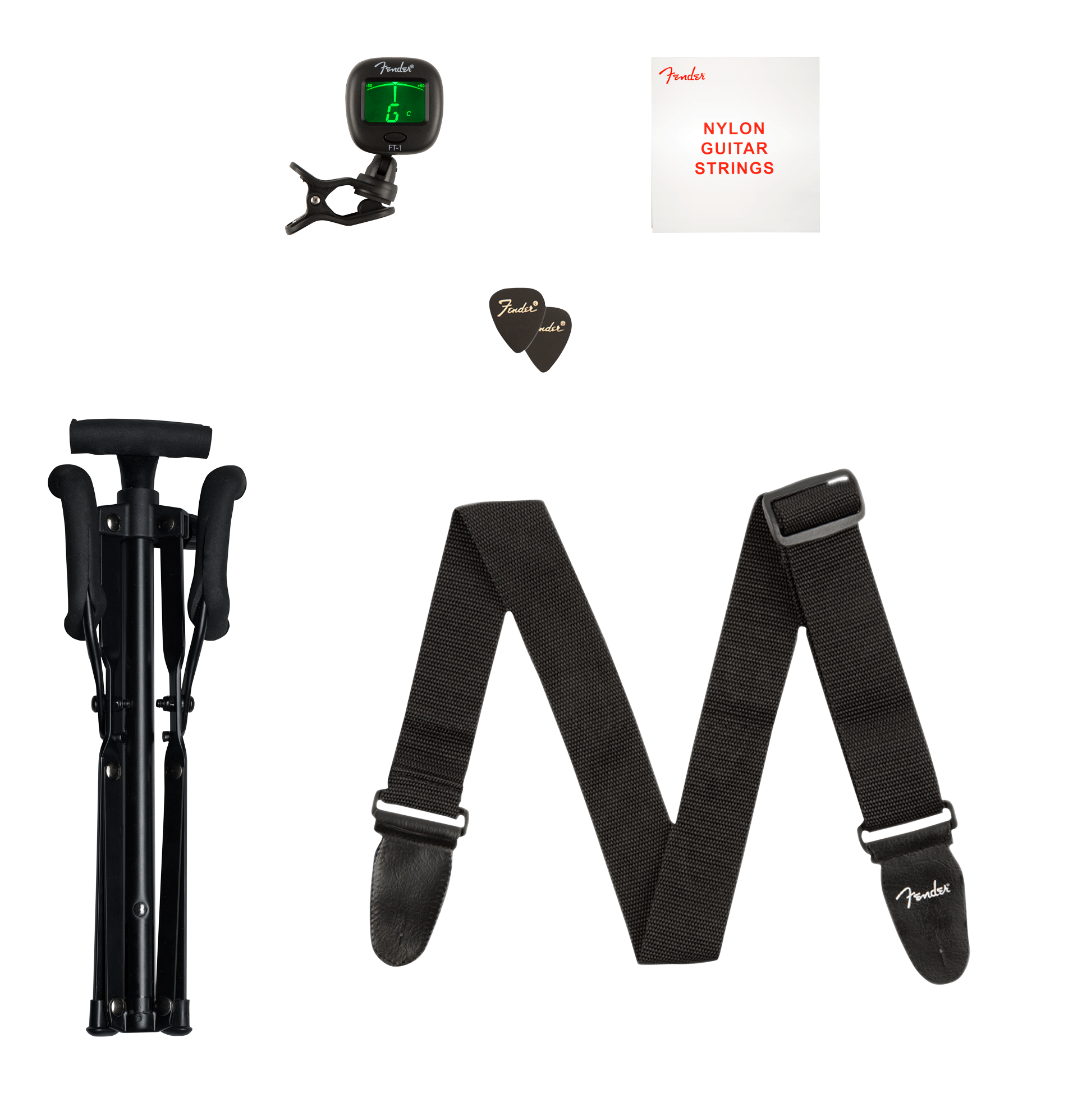 El Fender Acoustic Starter Pack también incluye una funda, correa, púas, afinador de clip, soporte para guitarra y un juego adicional de cuerdas.