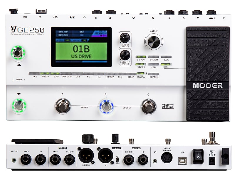 El GE250 ofrece muchas de las mismas características que se esperan de una unidad multiefectos GE, como 70 modelos de amplificador digital, más de 180 efectos diferentes, cadena de efectos personalizables, caja de ritmos, metrónomo, looper de 70 segundos y preajustes fácilmente personalizables y almacenables. Incluso toma prestadas algunas características del GE300 como Tone Capture para crear sus propios modelos de amplificador digital. MIDI IN / OUT, fácil integración con FX LOOP y soporte de audio USB de baja latencia, que lo hacen adecuado para presentaciones en vivo o grabaciones directamente a un PC.