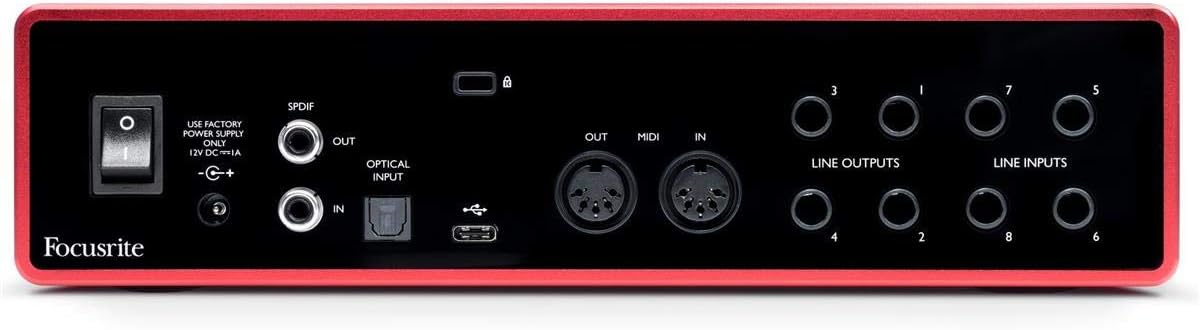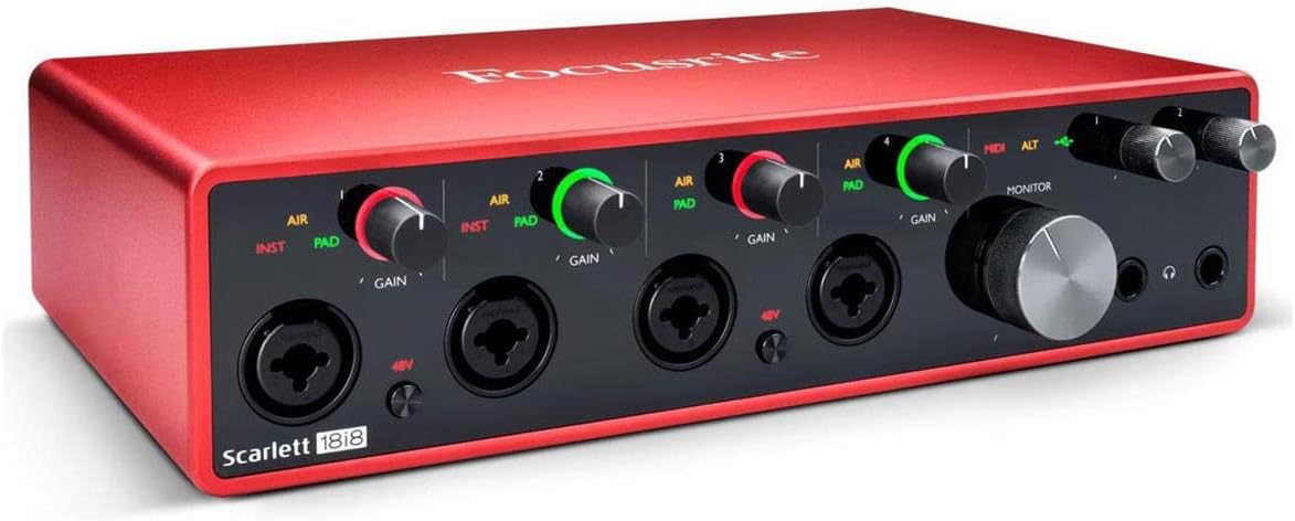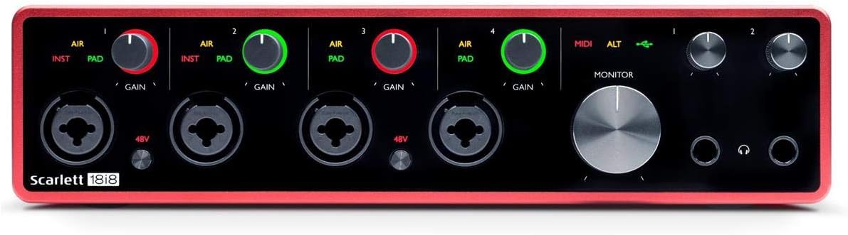 • Cuatro de los preamplificadores de micrófono de mejor rendimiento que la gama Scarlett ha visto, ahora con modo Air conmutable para dar a tus grabaciones un sonido más brillante y más abierto. Dos entradas de instrumento de gran altura para conectar tu guitarra o bajo. Ocho entradas de línea equilibradas para conectar sintetizadores, máquinas de tambor y otras fuentes de nivel de línea. Cuatro salidas de monitor con tecnología antigolpe y conmutación de altavoces.