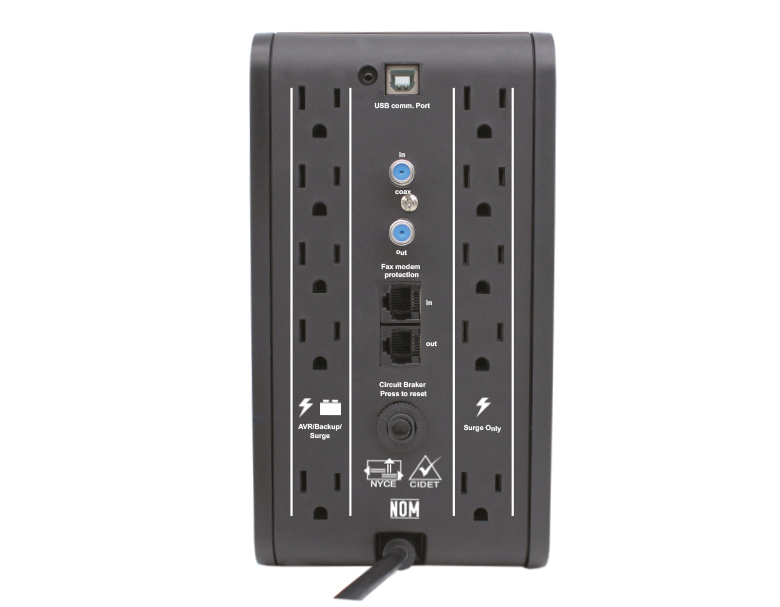 UPS interactivo de línea de 1000VA para hogar / oficina. Baterías de plomo-acido selladas internas, regulador de voltaje, supresor de sobre tensión y salidas de derivación para cargas más grandes. Proporciona energía continua a enrutadores WIFI, sistemas de alarma y equipos informáticos.