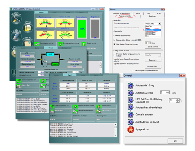 Los modelos de mayor capacidad en torre ofrecen una pantalla LCD avanzada que es interactiva e ilustra funciones como niveles de batería, % de carga, % de batería, voltaje de entrada, voltaje de salida, Hz. Las interfaces web permiten el monitoreo local y remoto. Las alarmas audibles indican el funcionamiento y los niveles de batería. Certificado por las agencias reguladoras NOM, ISO9001-2015, ISO14001, RETIE.